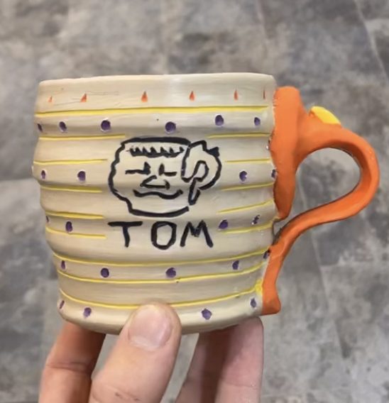 In the studio, I’ve been working with a lot of leather-hard clay. I’m doing a lot more coloring with underglaze (a type of paint that fires with a matte finish) and I’ve also added some carving to the current batch of mugs I’m working on.